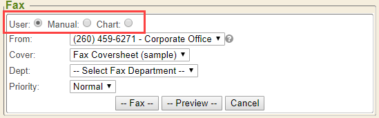 The Fax section of the Print Dialogue window has various fields to be filled out, dependent upon the mode selected (i.e., User, Manual, or Chart).