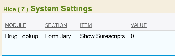 - System Setting E-Chart | Meds | SureScripts Staging must be disabled (value 0) when e-prescribing is live on the production database.