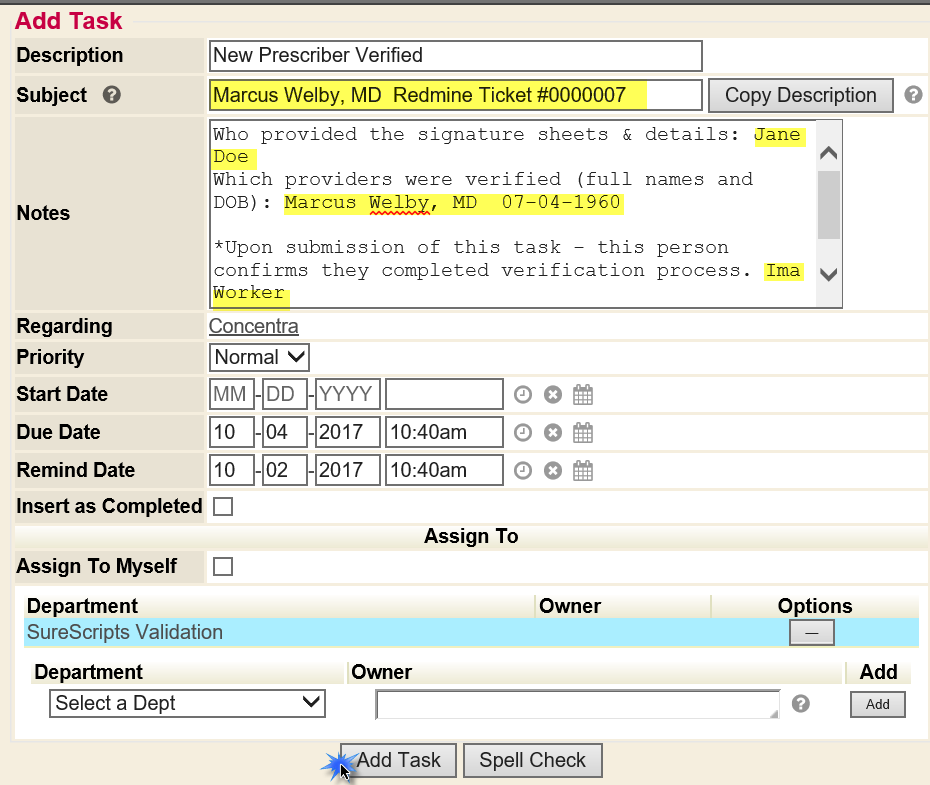 - Navigate to the DMS, locate the client, and Add Task of New Prescriber Verified.
