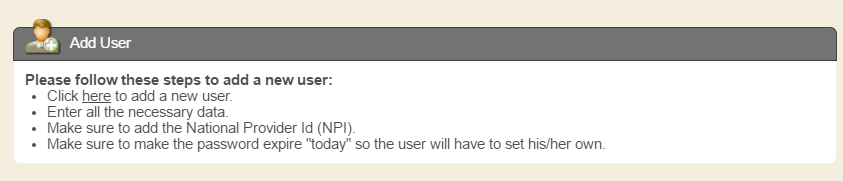 Users and providers utilizing the Enterprise Health system can be added manually, much like how locations are added. The manual method, however, is typically used in WebChart systems. In Enterprise Health systems, the workflow tends to use charts for every patient and user. In these cases, the Enterprise Health system may already be set to create a user when a chart is registered manually (or via an HR interface), by way of the Enable PUR Routine system setting, where the correct relationships can then be established between the chart and user, for portal functionality and other modules, as needed. If the Enable PUR Routine system setting is enabled, users would never add additional users manually, using the steps below. Users would need registered as a chart in the system first, then their user profile (that gets autocreated via this enabled system setting functionality) may be edited and updated from the Access Control tab of the Control Panel. From here, after locating the user, simply click the Edit link in the Options column, and update all necessary information.